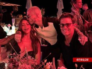 TB12 cambió de asiento en el yate para sentarse junto a Sofía durante una cena… y Sofía publicó una foto de ellos sentados juntos en una mesa, con J Balvin acercándose para saludarla y darle un beso en la frente.